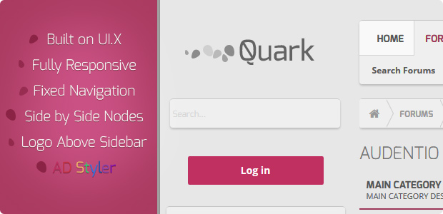Antiquark is the counter-design to Quark and essentially the light version of the XenForo theme. It comes out with a gamer pink color, but can be easily changed to blue or green very easily. Some of the features include side by side nodes, logo on top of the sidebar or logo on top of the navigation, fixed navigation, rounded avatars, fully responsive functionality, and much much more.
