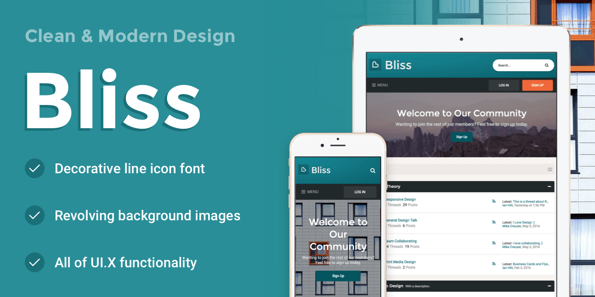 Bliss is a comfortable and naturally styled theme for XenForo built on the UI.X Framework. It features a decorative line icon font, a large welcome section with revolving background images, an off-canvas navigation, sticky header, and many more features.