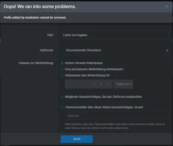 i will move a thread to a other forum and change the prefix but i have all rights to all prefixesIt is a feature, disable the "Block removing prefixes a user does not have access to add" option and it'll go away.