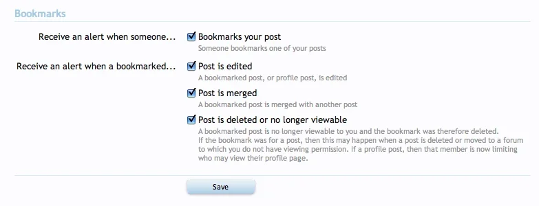 - Should a post be moved to a thread its creator cannot view, the bookmark item will be deleted.